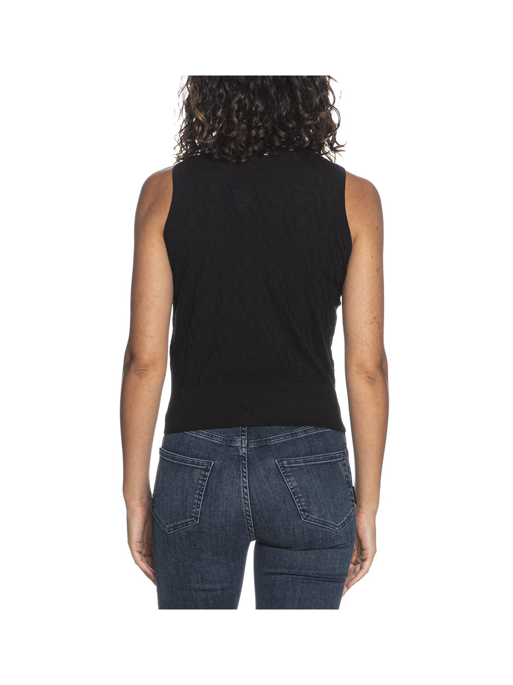 Il Top da donna Armani Exchange è realizzato in filato jacquard con monogrammi tono su tono in cotone, viscosa e seta. Senza maniche, presenta una polacchetta logo dorata sul retro del collo, un elegante collo a Lupetto e cannolè a costine. Un capo versatile e chic, perfetto per completare outfit eleganti e casual.