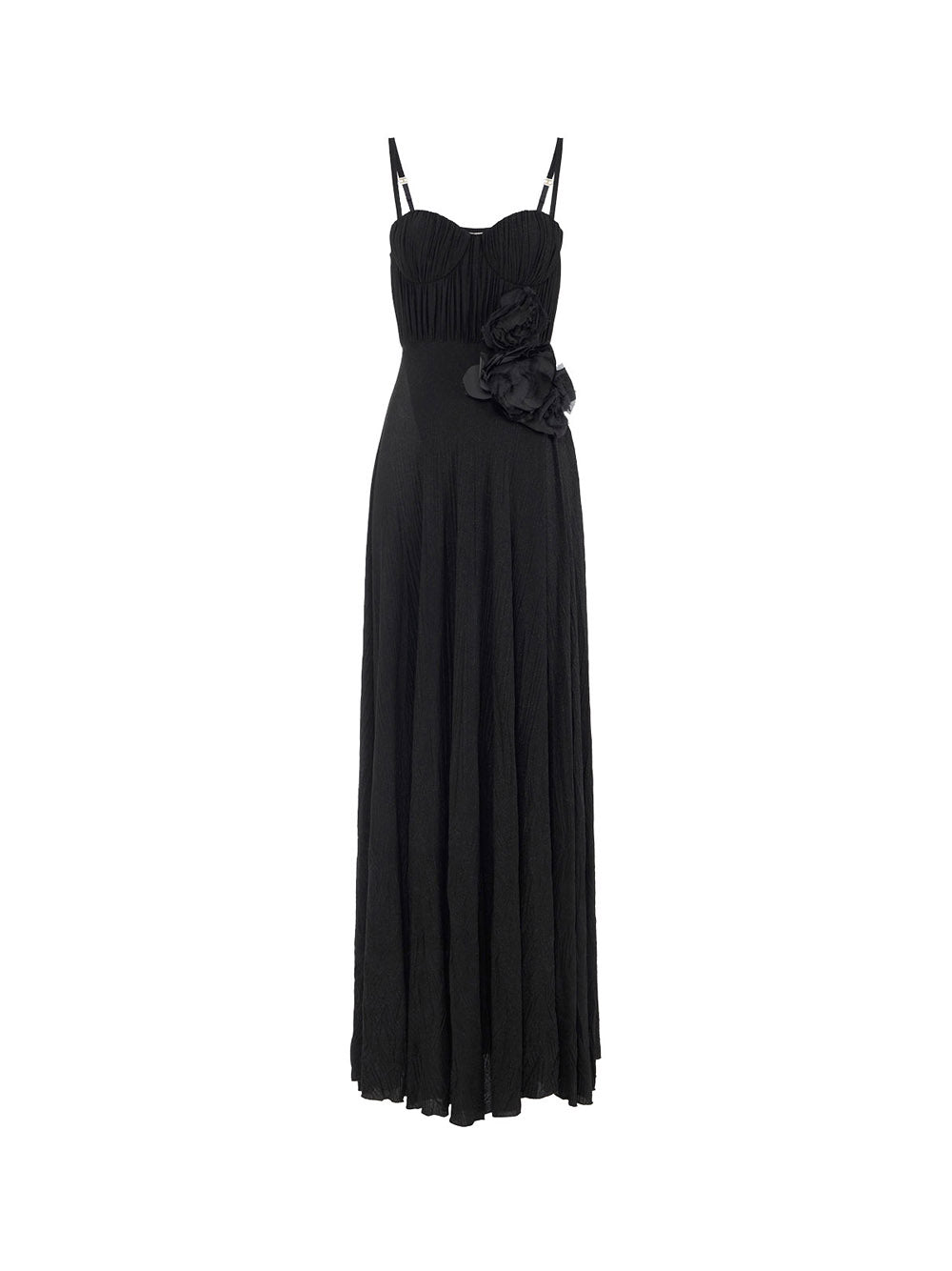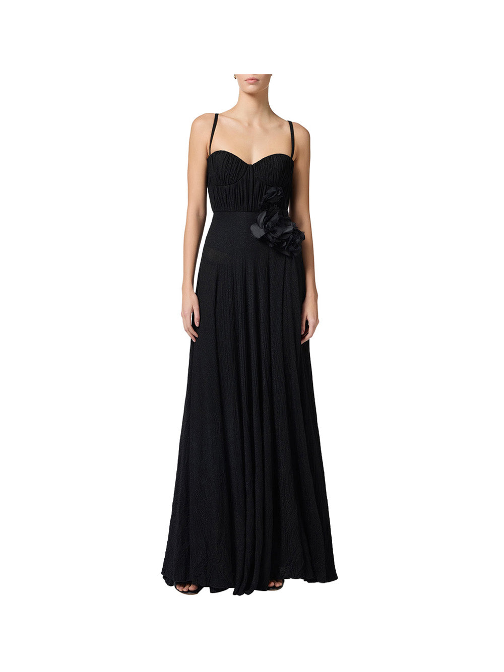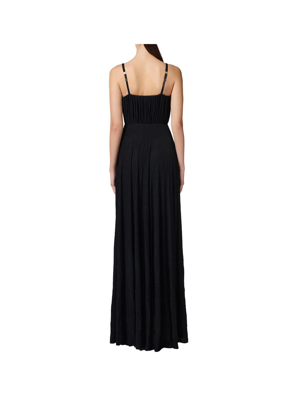 L'abito da sera nero di Elisabetta Franchi è un capo elegante e raffinato, perfetto per occasioni speciali. Realizzato in jersey lurex, presenta spalline sottili regolabili e una decorazione floreale ricamata su un fianco. La gonna ha uno spacco laterale e una texture stropicciata con effetto foliage. La vestibilità è slim e la lunghezza totale è di 165 cm per la taglia 40 IT. Completo di zip invisibile sul fianco, è un capo di alta moda che sicuramente attirerà l'attenzione.