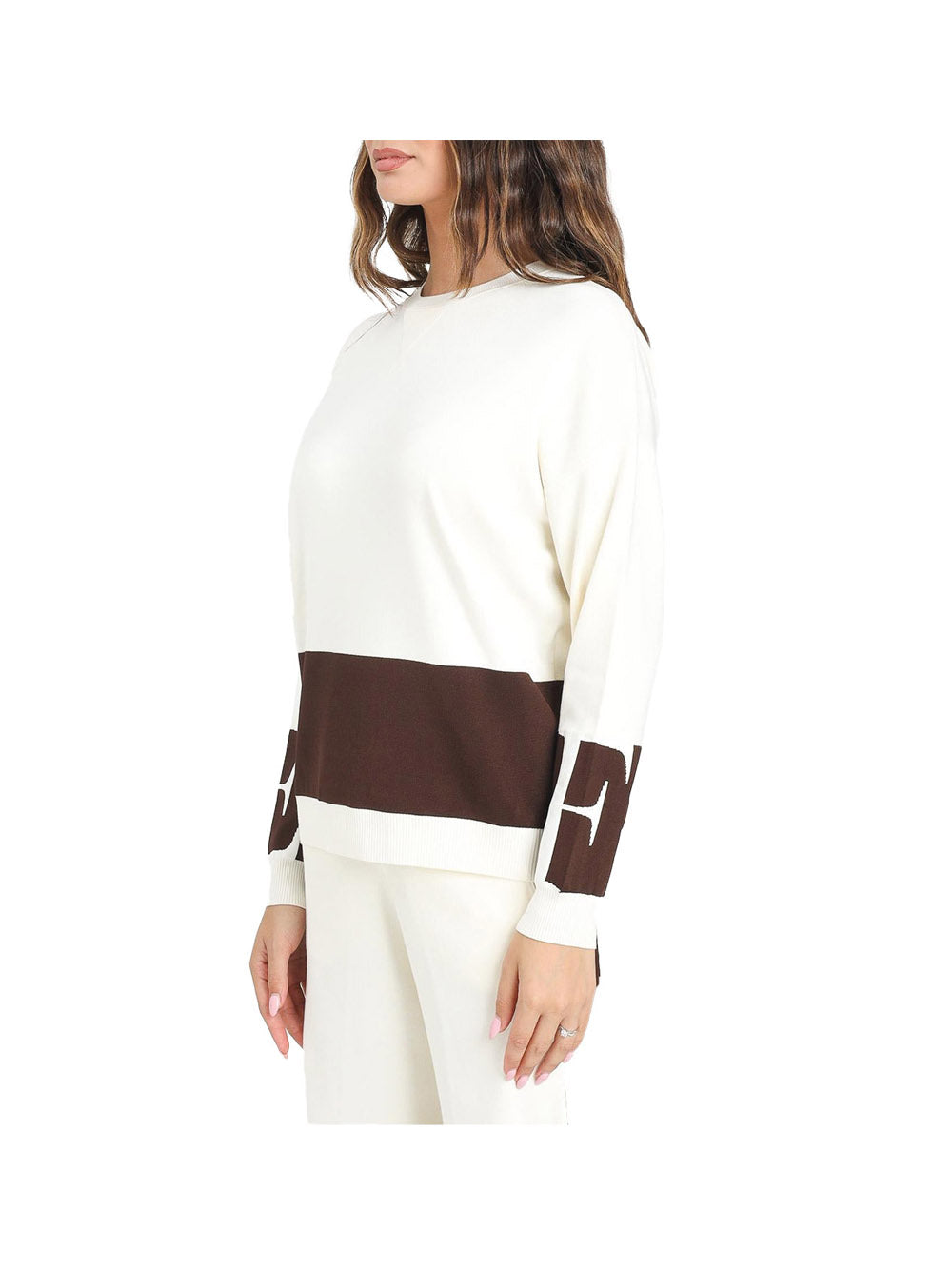 La maglia tricot Elisabetta Franchi in viscosa bianca con bande lucide è un capo sofisticato e di tendenza. Con girocollo ampio e loghi intarsiati sulle maniche e sul retro, crea un effetto color-block moderno. La lunghezza di 65 cm per la taglia 40 IT si adatta perfettamente alla silhouette, mentre la composizione in viscosa e poliammide garantisce comfort e durata. La modella alta 177 cm indossa una taglia 40 IT, confermando la vestibilità regular del capo.